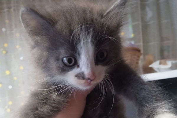 Єгор витяг маленького сірого кошеня, яке тремтіло від страху.
